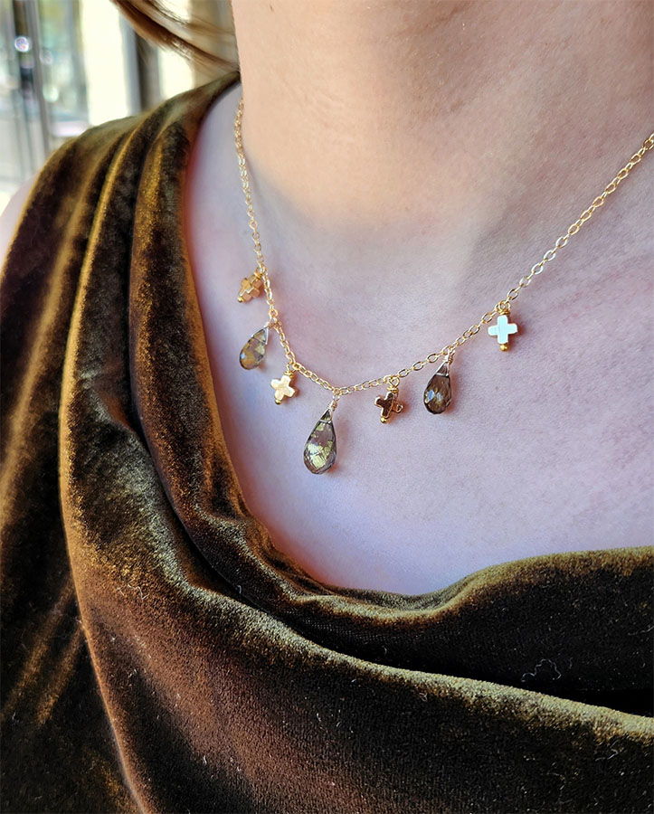 Empress Gold Foil Smoky Quartz and Cross Fringe Necklace