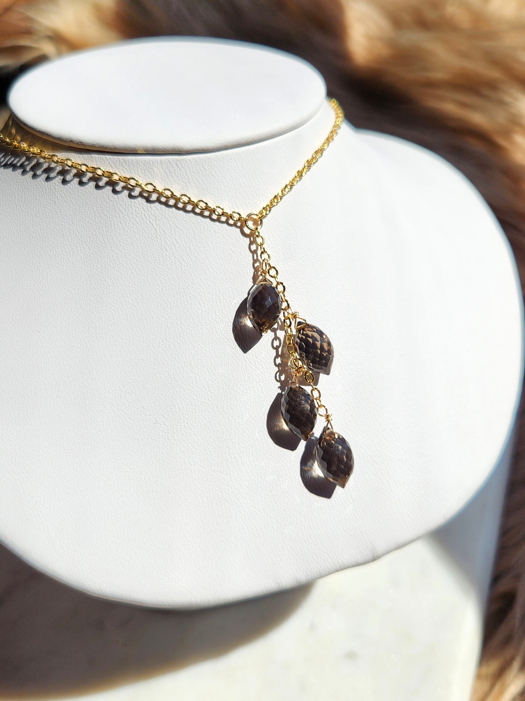 Smoky Quartz Dew Droplet Vertical Cluster Gold Necklace