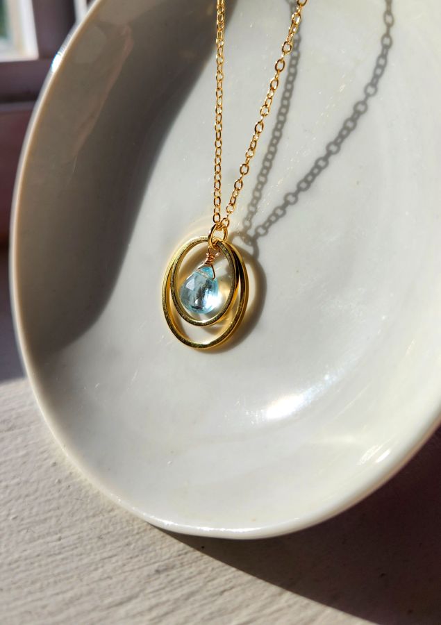 Blue topaz double gold circle necklace. Metals are 18kt gold plate over brass. All metals are nickel-free and lead-free.