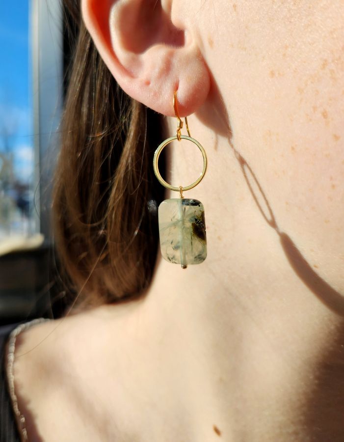 Prehnite rectangle stone circle earrings. Available in brass or gold plated metals.