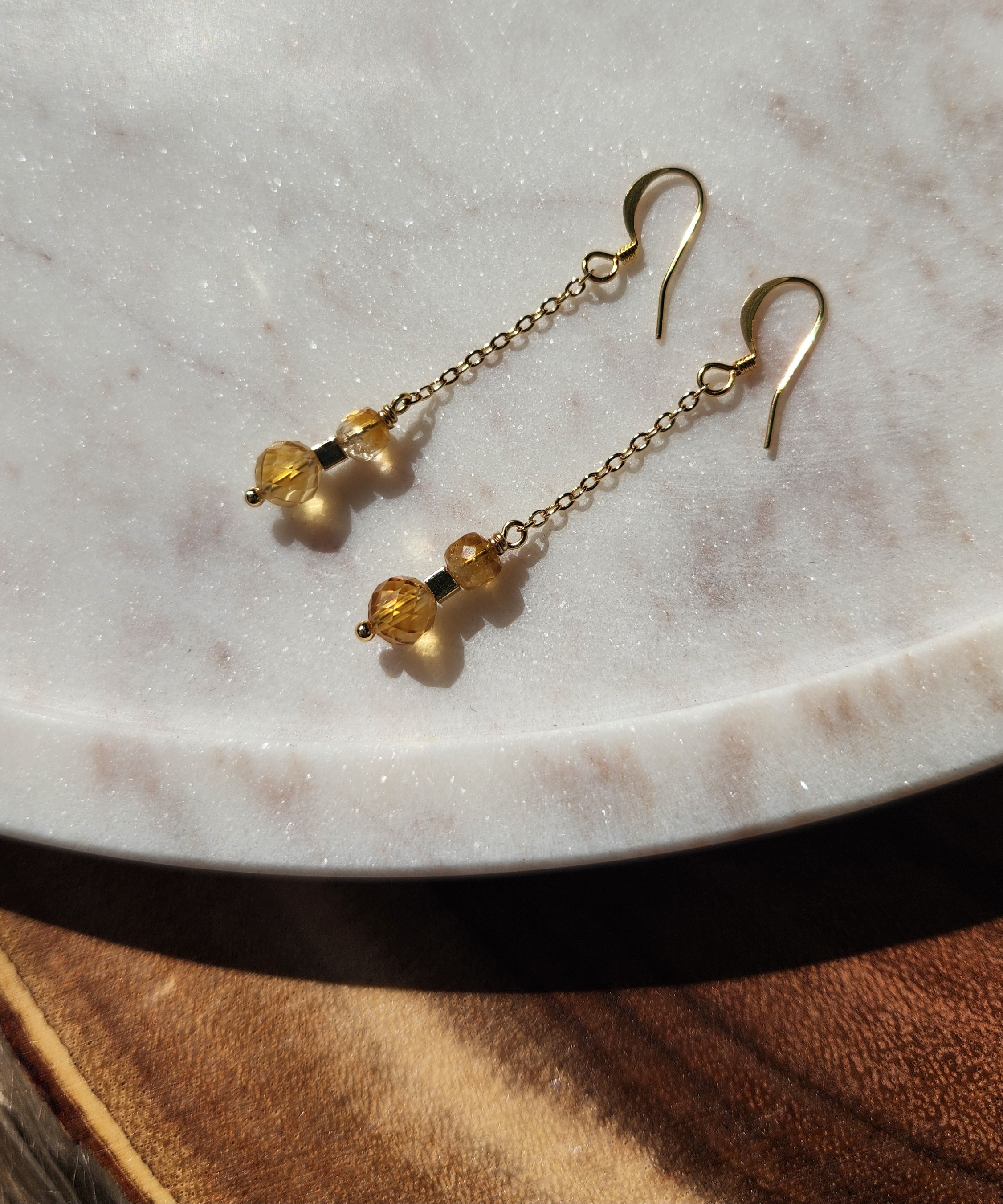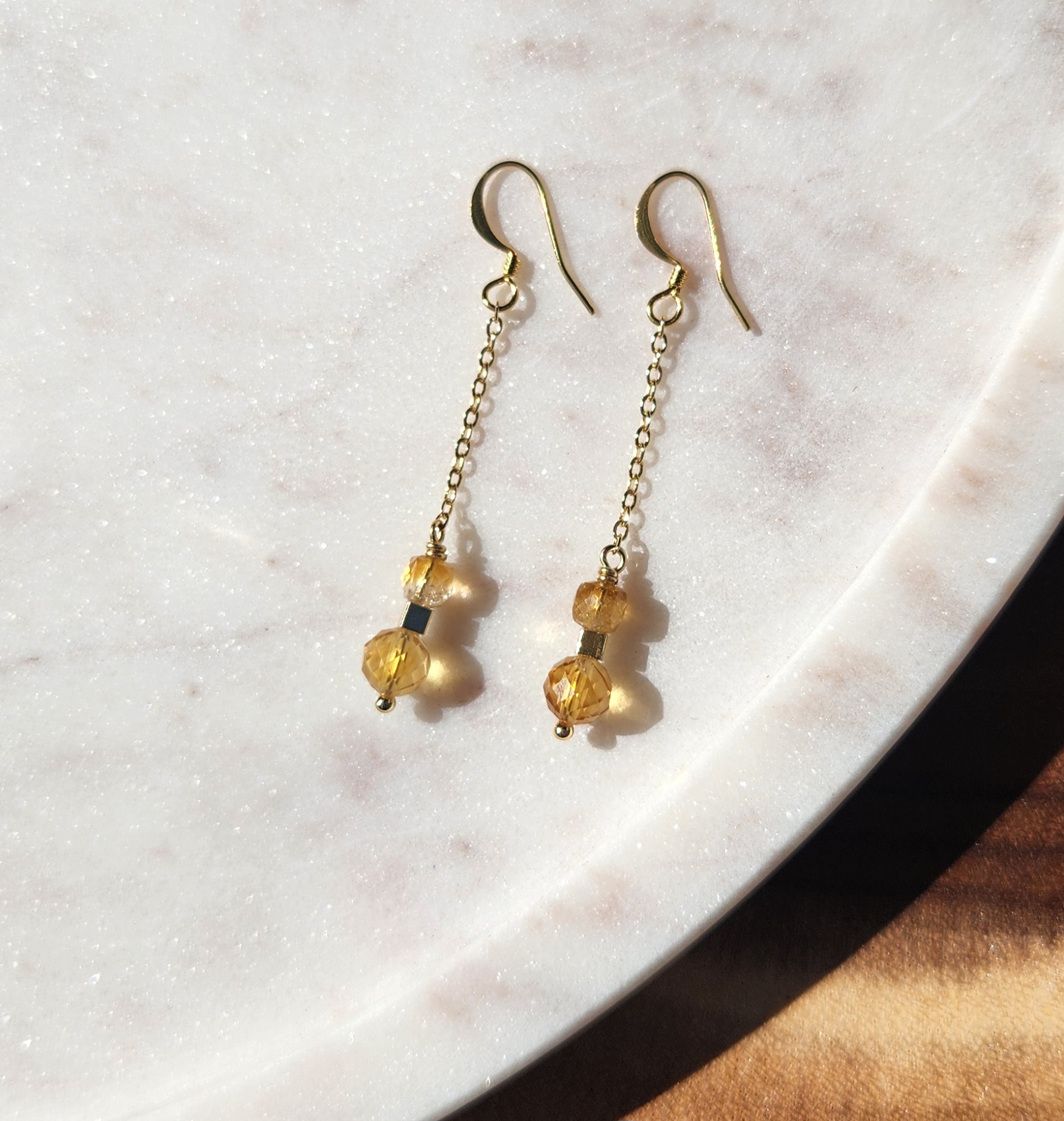 Citrine round and cube gold plated chain earrings.