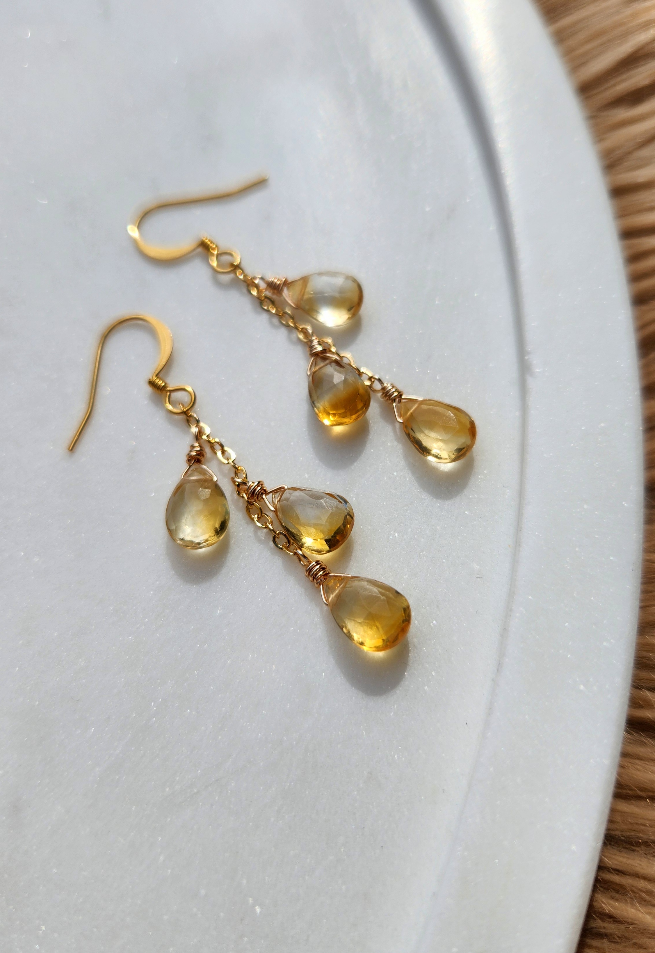 Citrine triple stone vertical gold plated chain earrings.