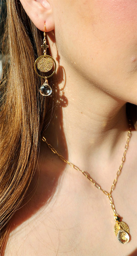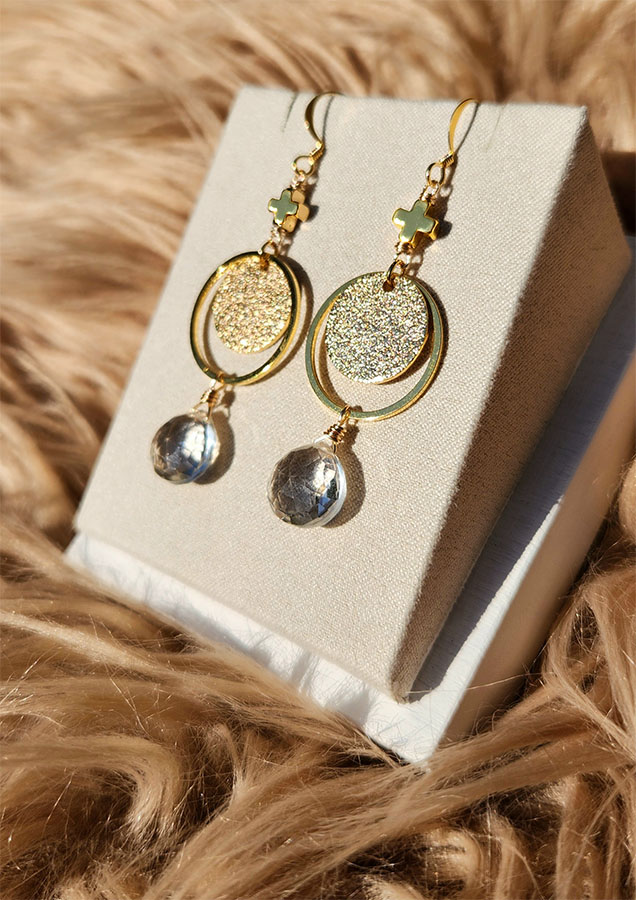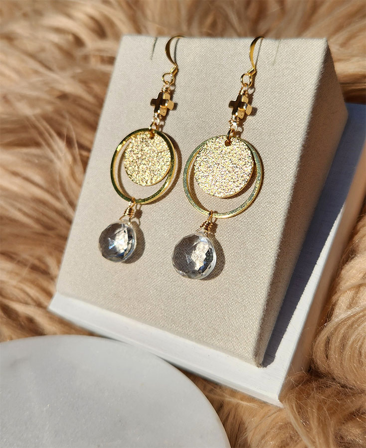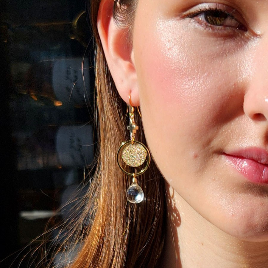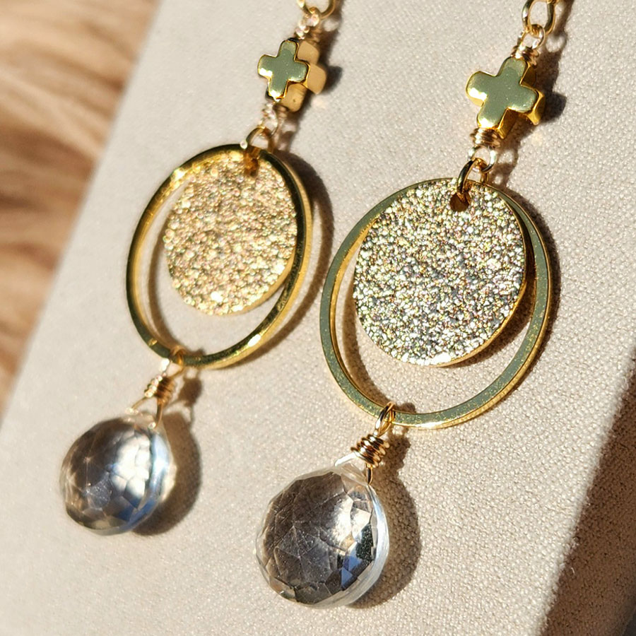 Medieval inspired gold plated cross, sparkly disc and circle clear quartz earrings.