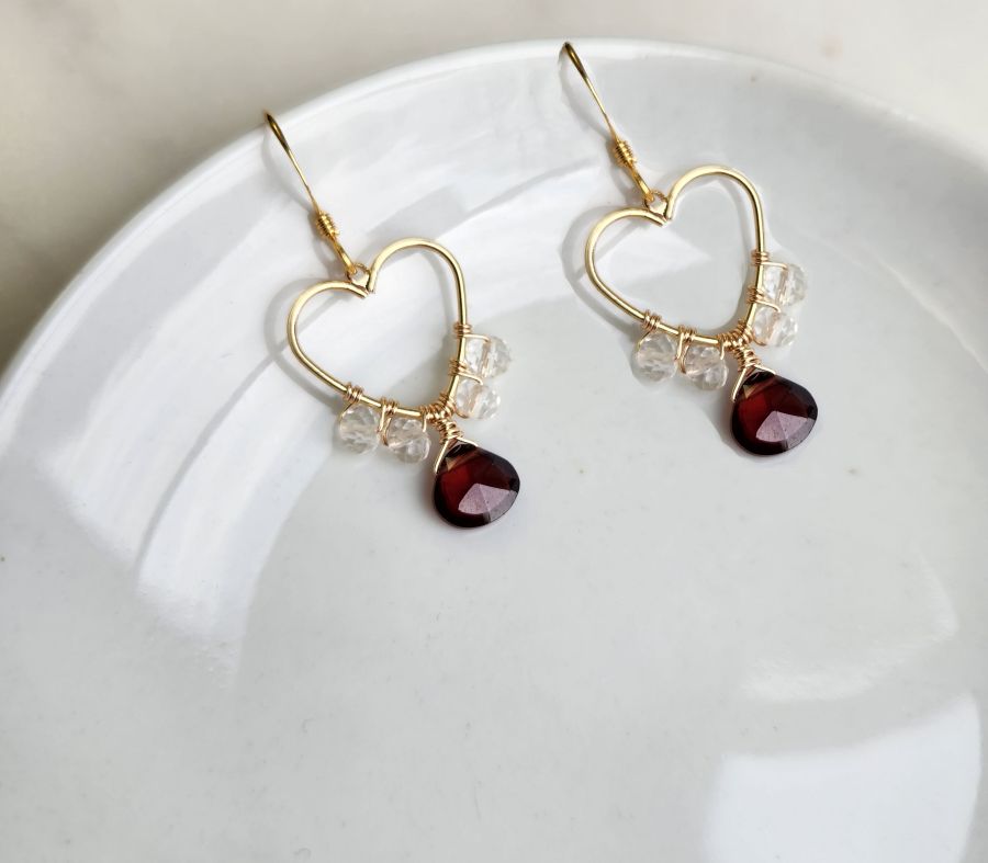 Garnet and clear quartz wrapped heart earrings.