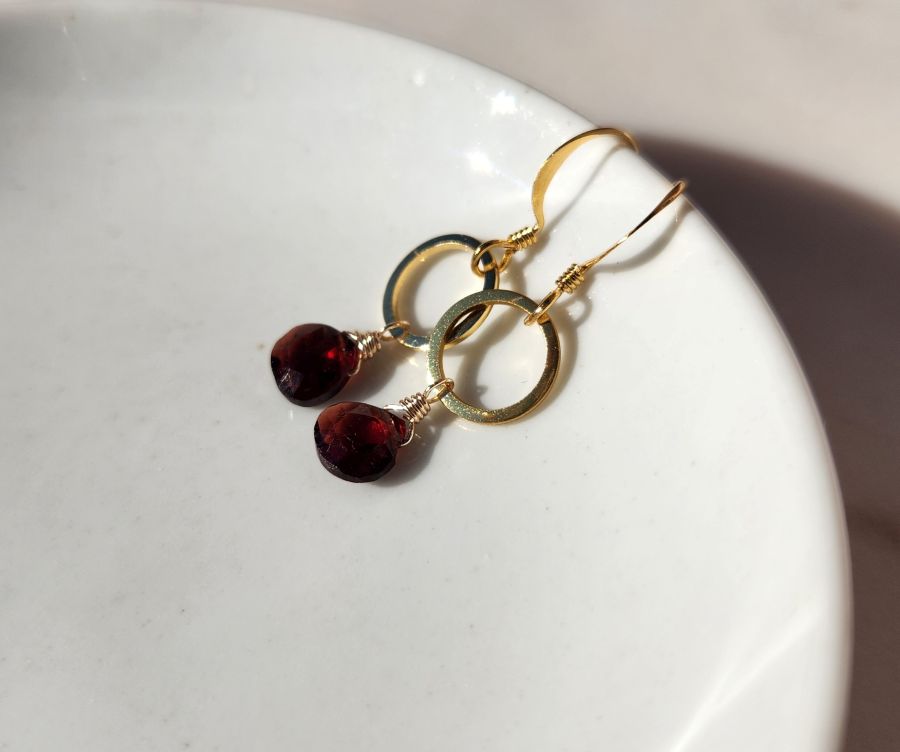 Garnet gold circle earrings. Metals are 18kt gold plate over brass. All metals are nickel-free and lead-free.
