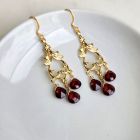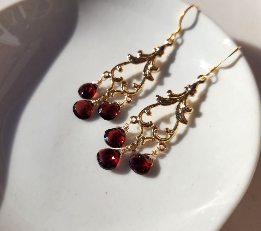 Garnet vintage inspired gold chandelier earrings. Metals are 18kt gold plate over brass. All metals are nickel-free and lead-free.