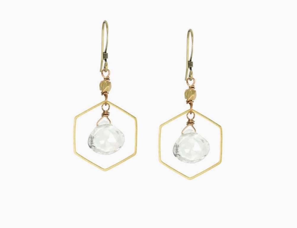 EDGY PETAL clear quartz hexagon earrings with brass bead accent.