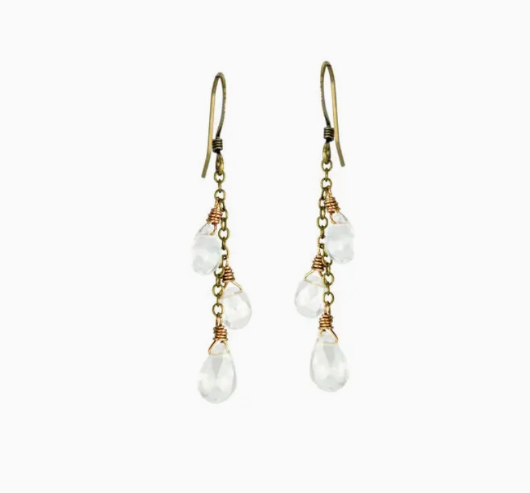 EDGY PETAL clear quartz delicate triple stone vertical droplet chain earrings.