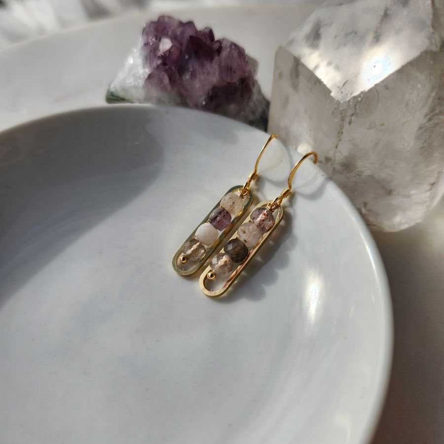 Seven crystal aka Melody Stone gold peapod earrings. Metals are 18kt gold plate over brass. All metals are nickel-free and lead-free.