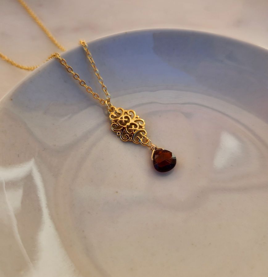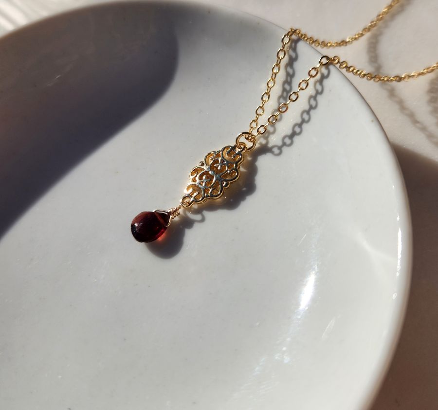 Garnet gold filigree pendant necklace. Metals are 18kt gold plate over brass. All metals are nickel-free and lead-free.