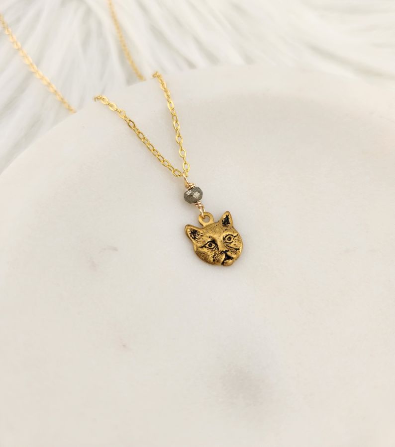 Cat face with pyrite charm gold necklace