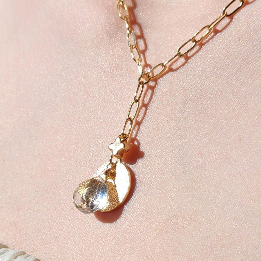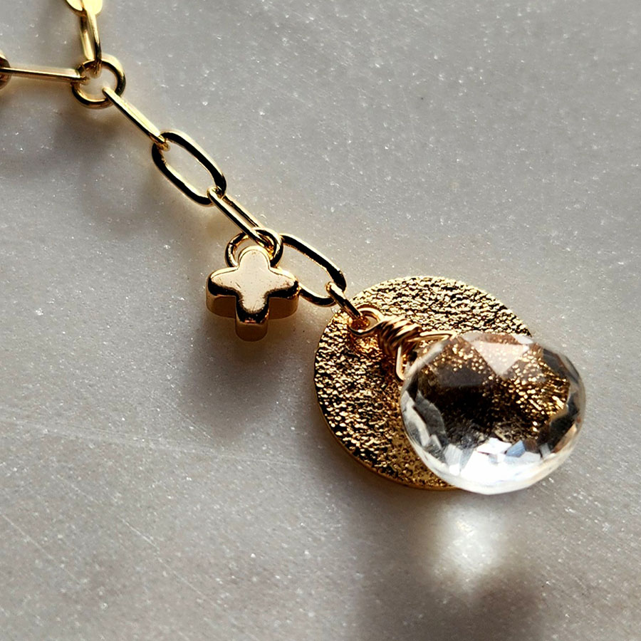 Medieval inspired clear quartz, sparkly disc, and cross gold plated oval Y necklace.