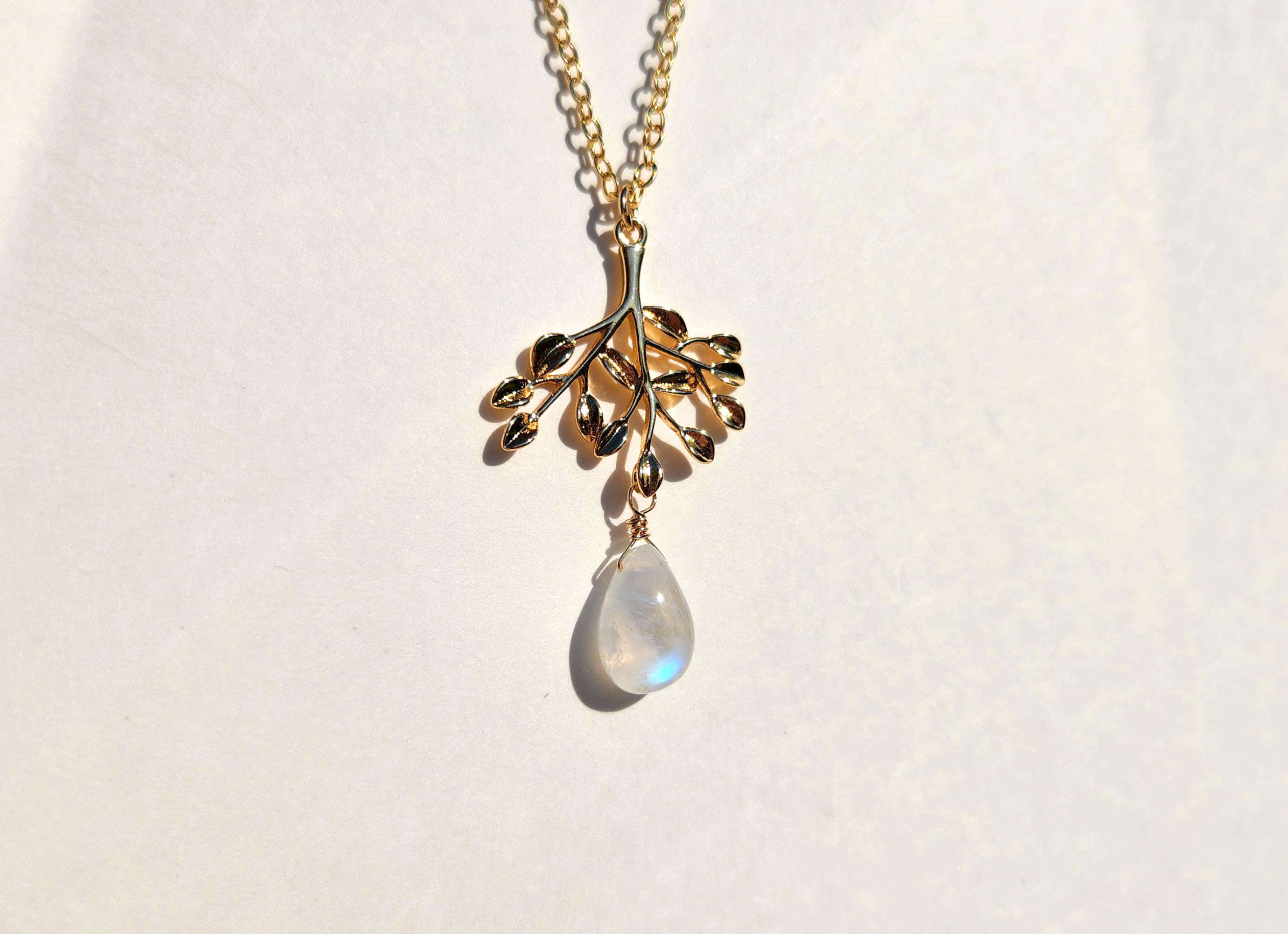Rainbow moonstone gold tree branch necklace. Metals are 18kt gold plate over brass. All metals are nickel-free and lead-free.