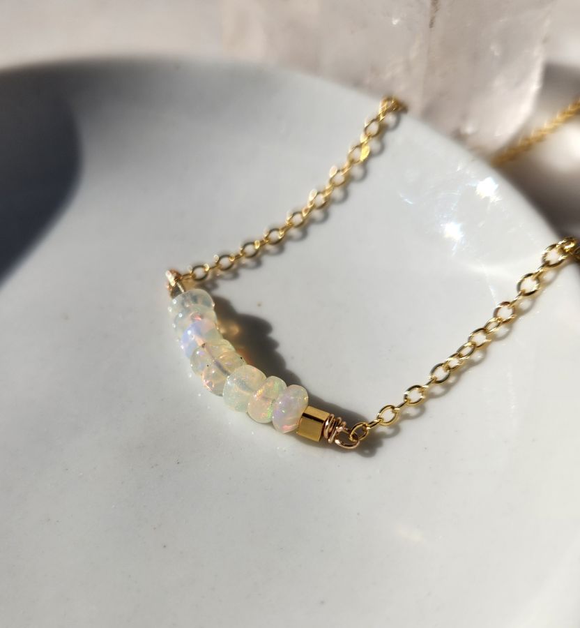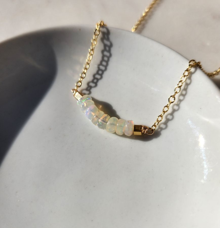 Ethiopian opal gold arc necklace. Metals are 18kt gold plate over brass. All metals are nickel-free and lead-free.