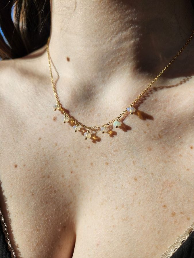 Ethiopian opal gold fringe necklace. Metals are 18kt gold plate over brass. All metals are nickel-free and lead-free.