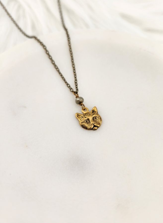 Cat face with pyrite charm brass necklace