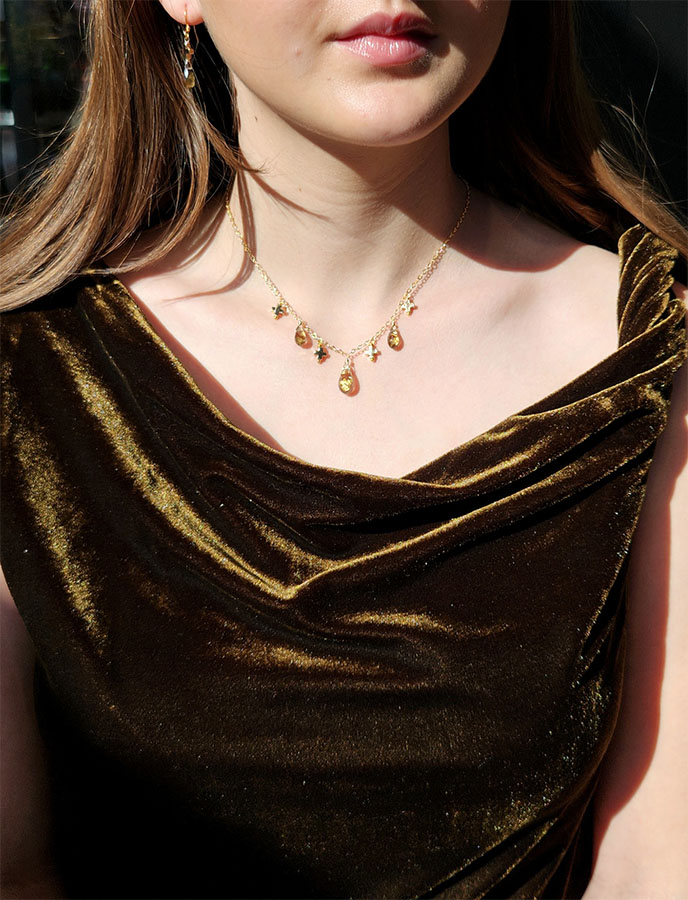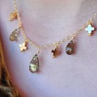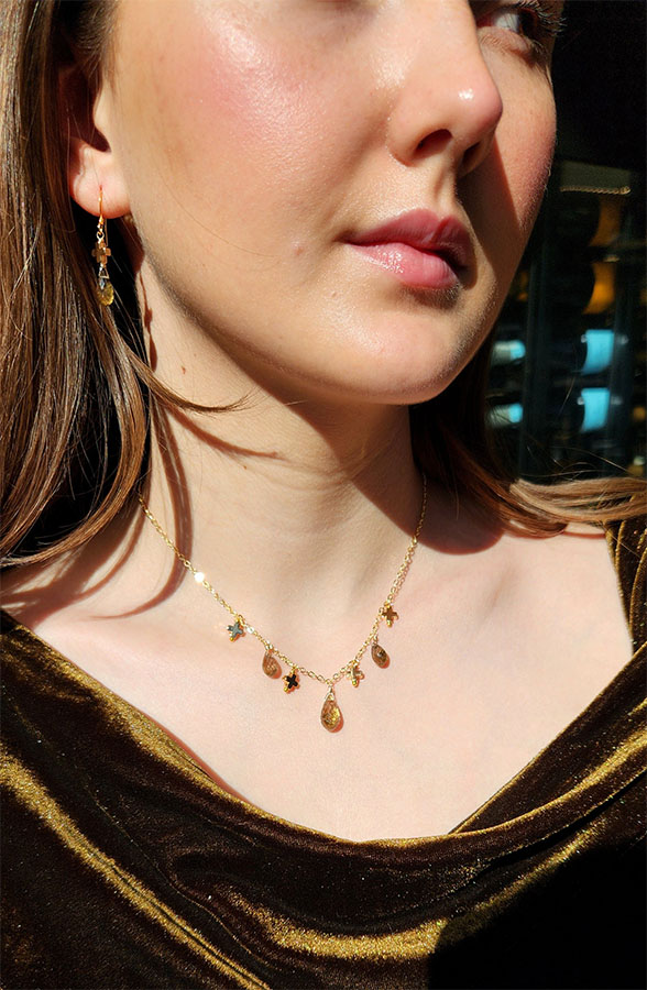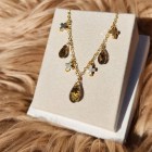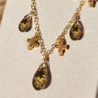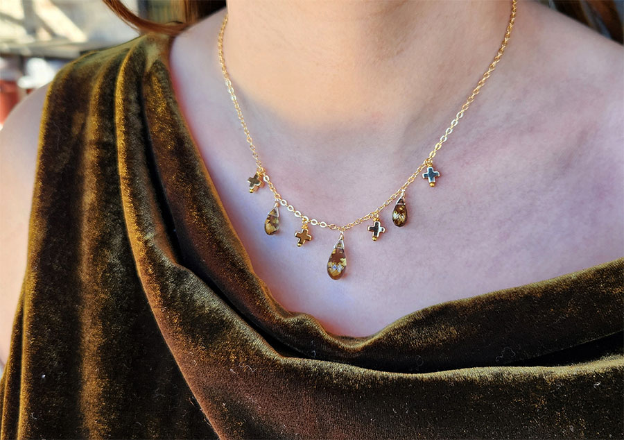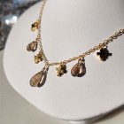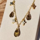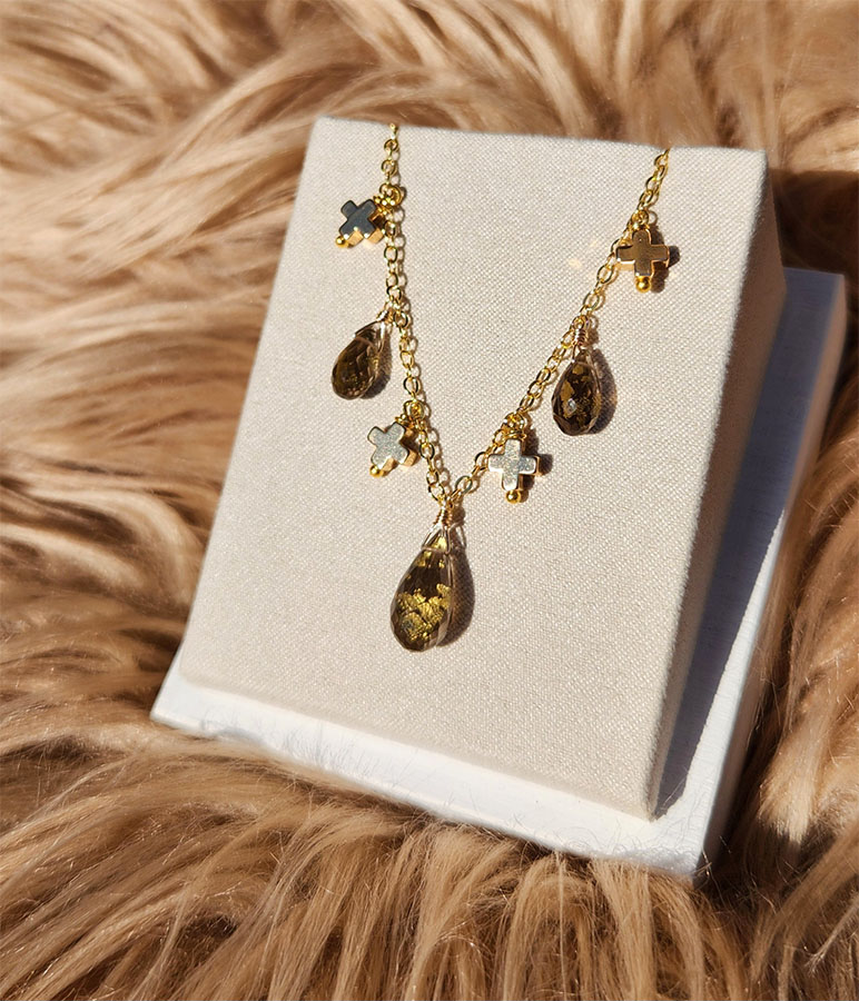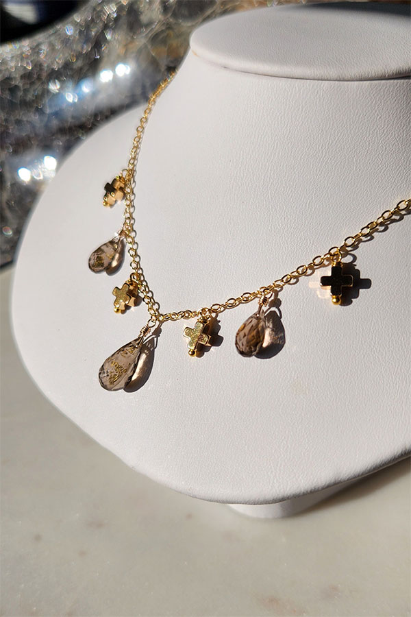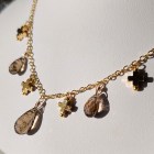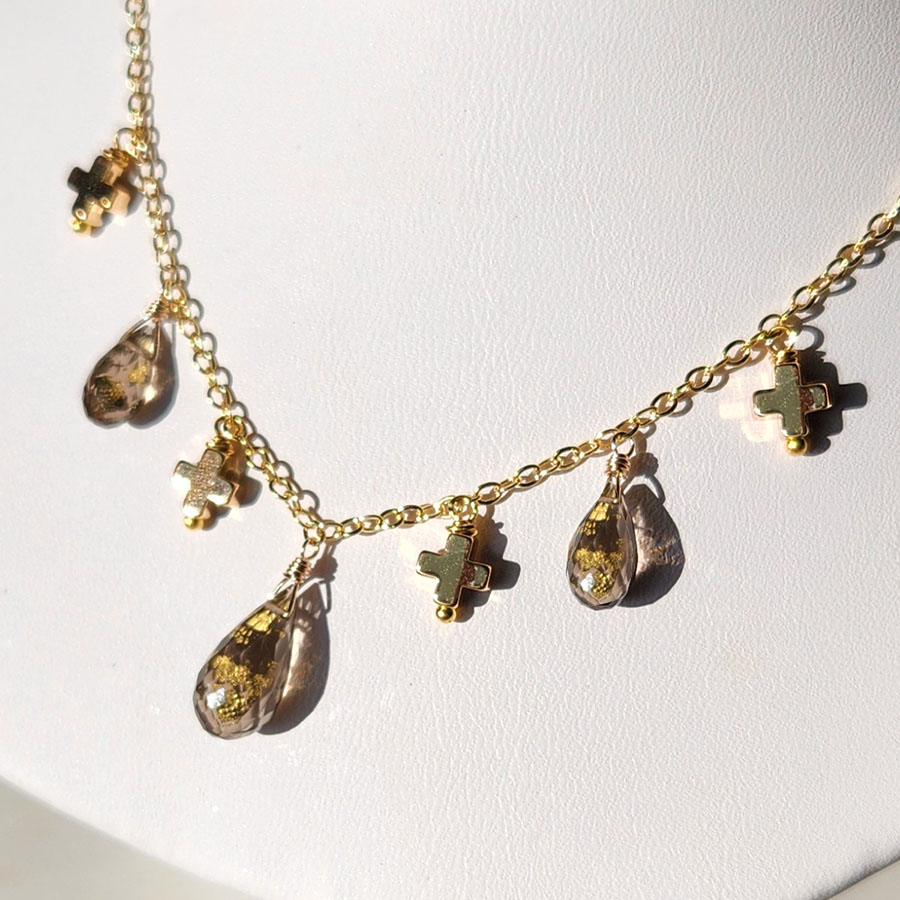 Medieval inspired gold foil smoky quartz and cross gold plated fringe necklace.