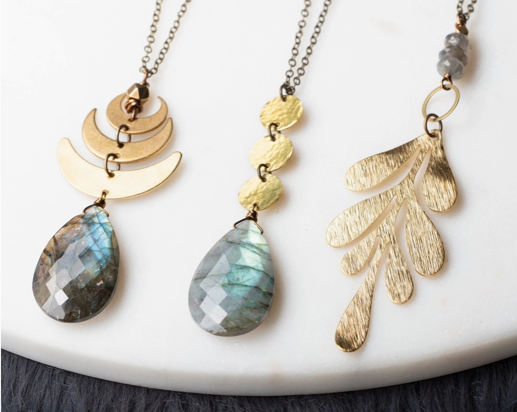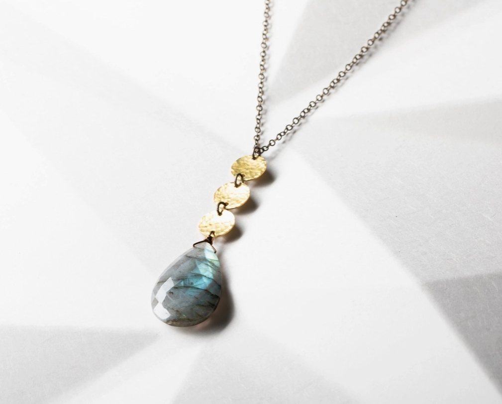 EDGY PETAL triple disc necklace with labradorite on long chain.