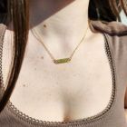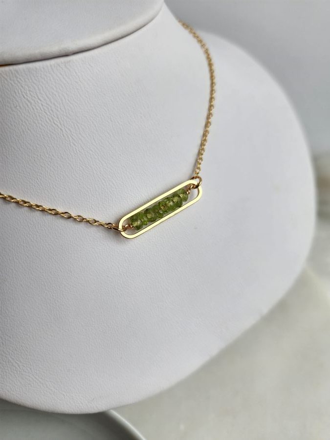 Peridot gold peapod necklace. Metals are 18kt gold plate over brass. All metals are nickel-free and lead-free.