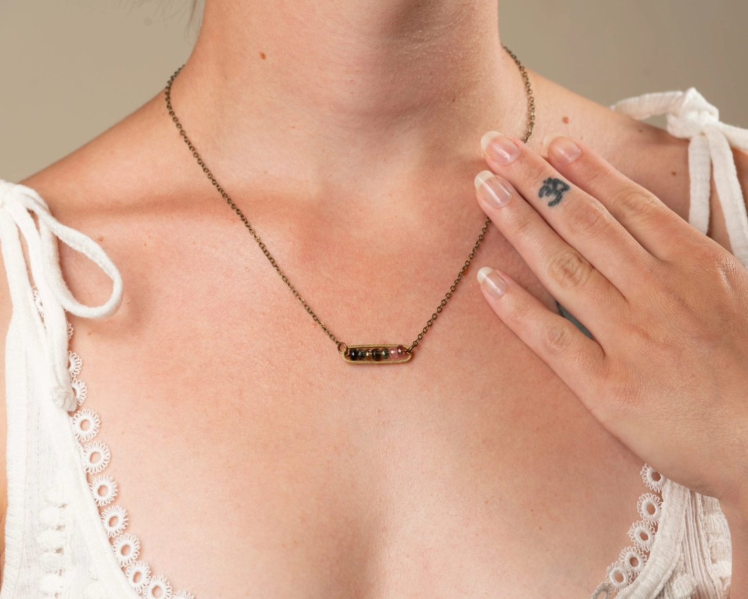 EDGY PETAL multicolor watermelon tourmaline peapod necklace. Featuring gorgeous multicolor watermelon tourmaline beads set in golden raw brass. This is one of our most popular necklaces and makes a great gift!