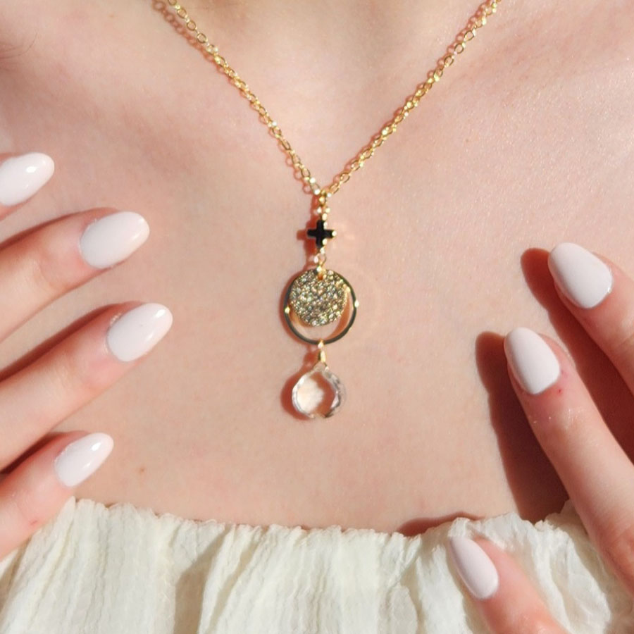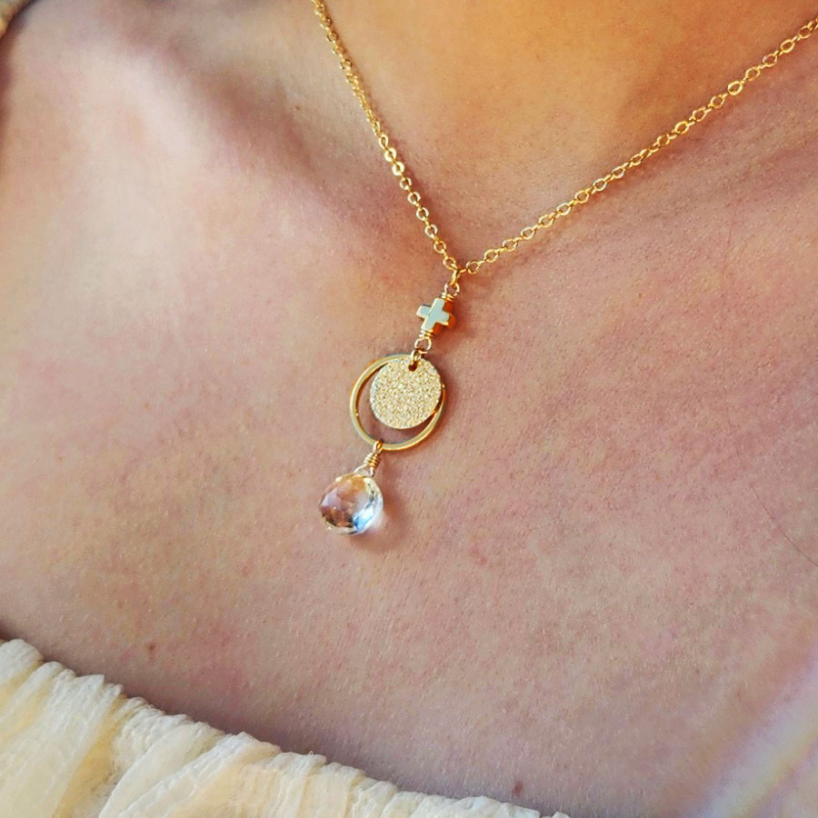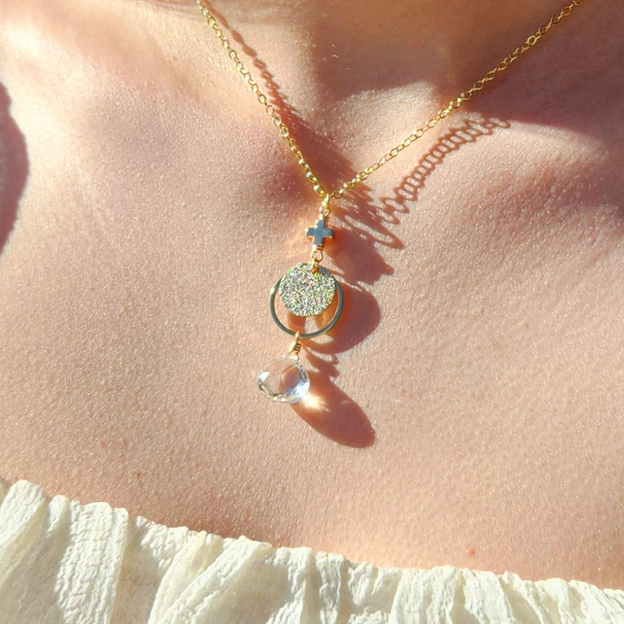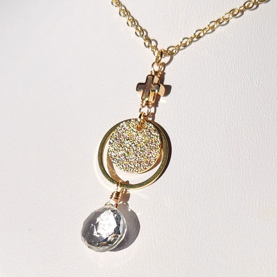 Medieval inspired gold plated cross, sparkly disc and circle clear quartz necklace.