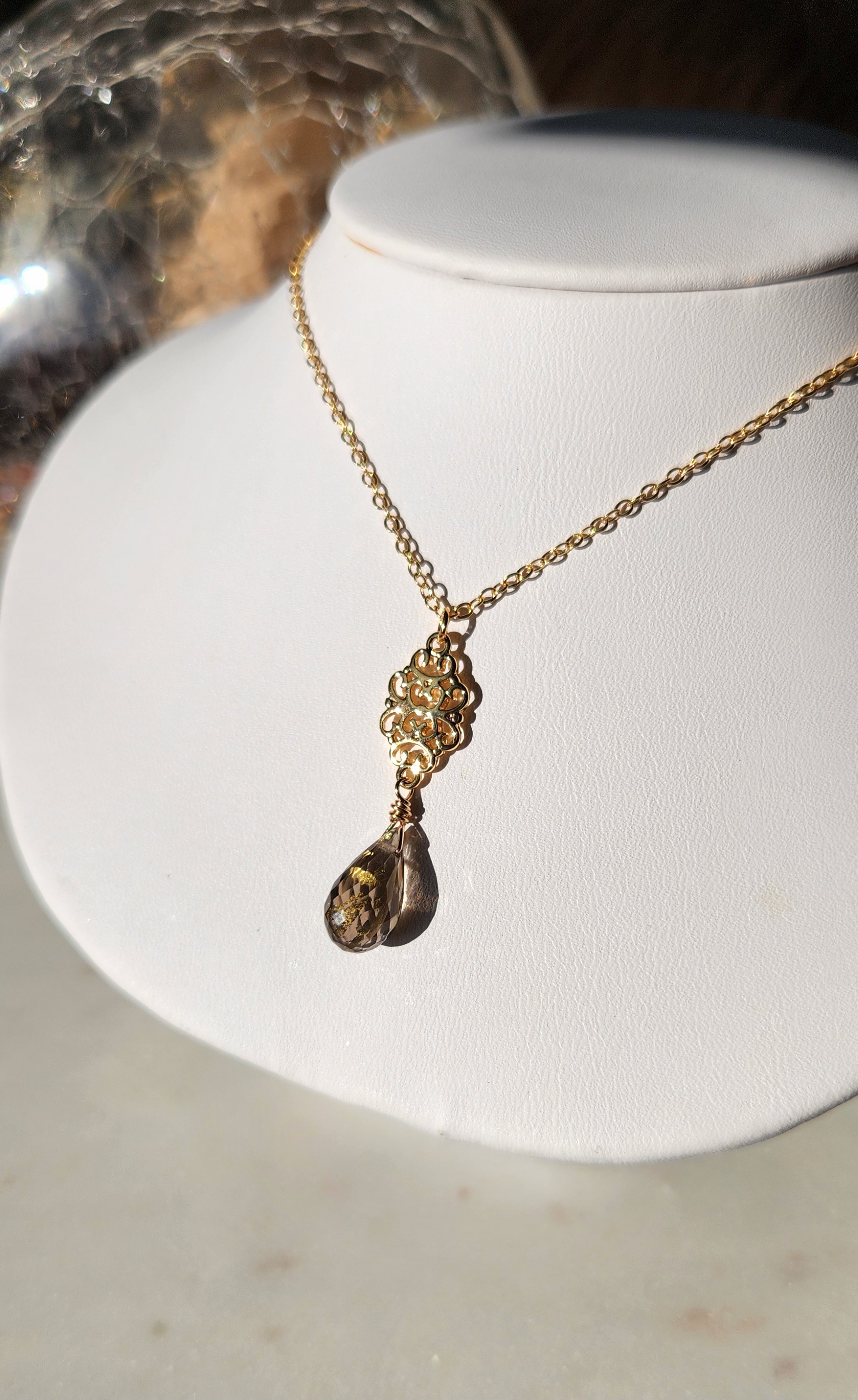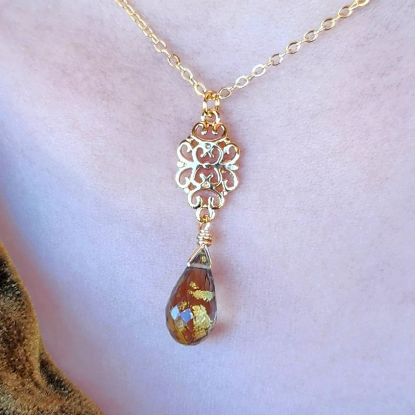 Medieval inspired gold foil smoky quartz gold plated filigree necklace.