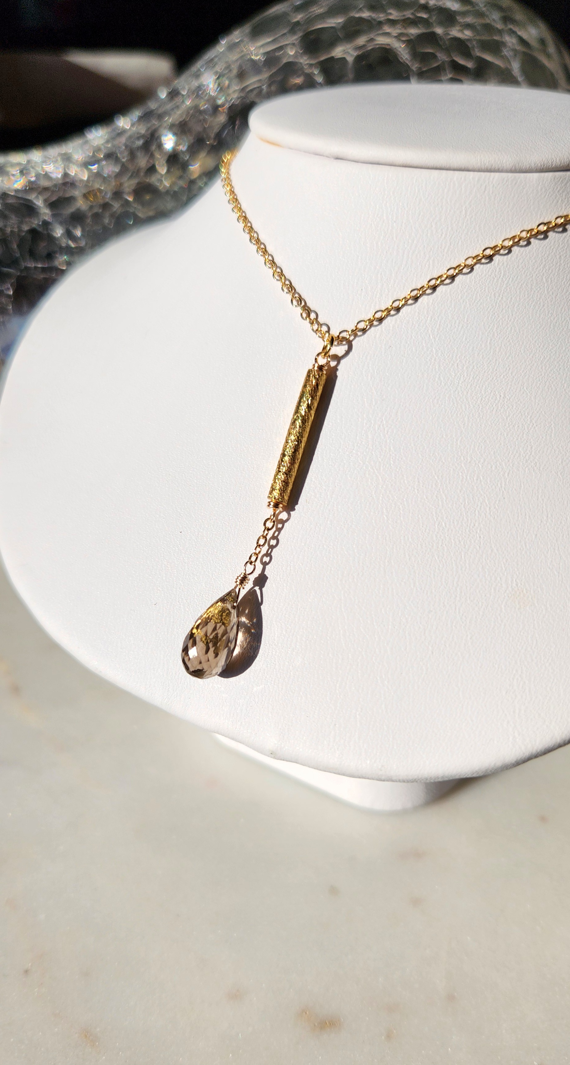 Medieval inspired gold foil smoky quartz textured tube gold plated Y necklace.