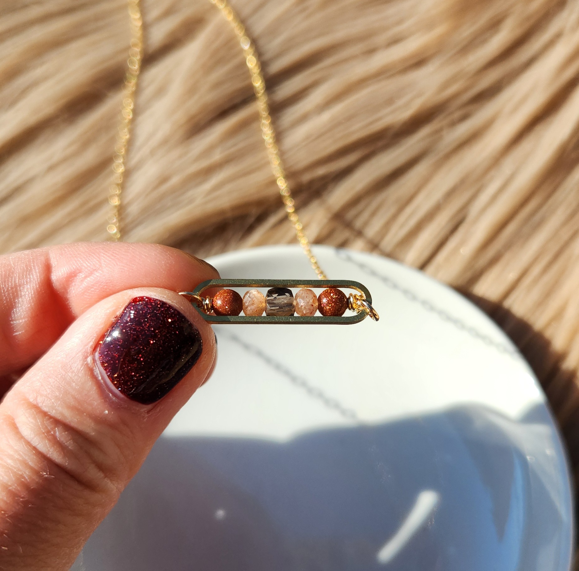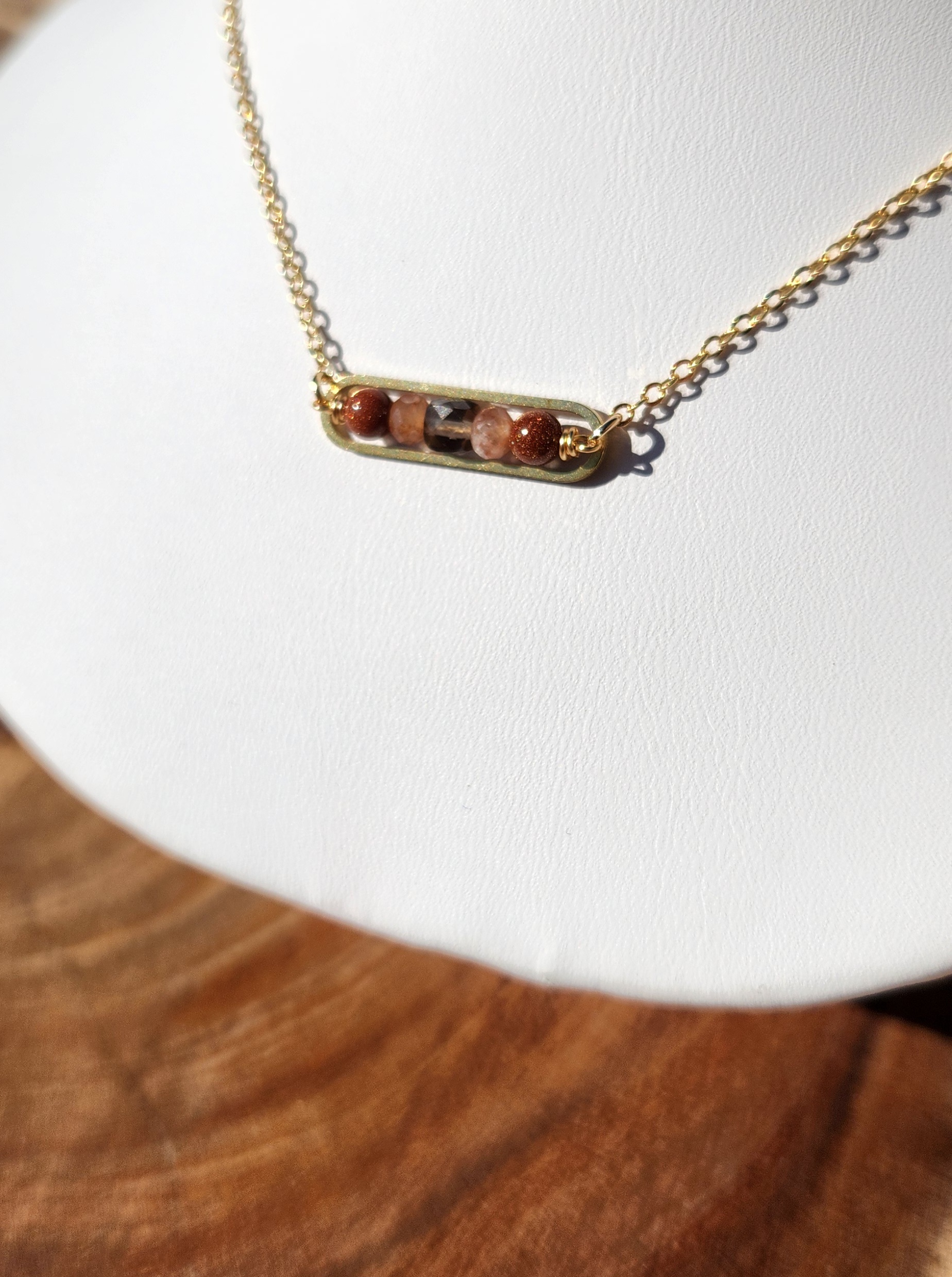 Goldstone, sunstone and smoky quartz gold peapod necklace