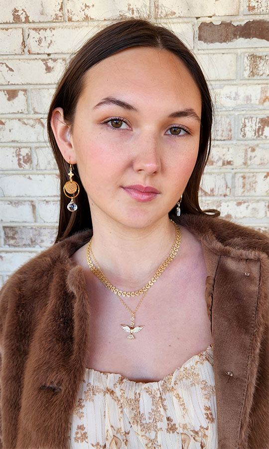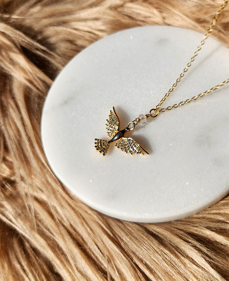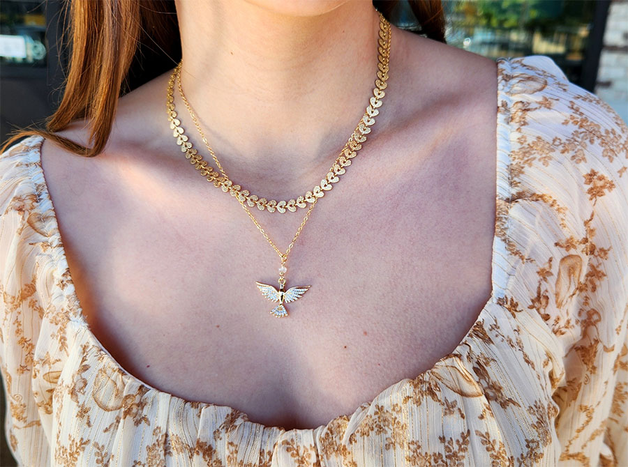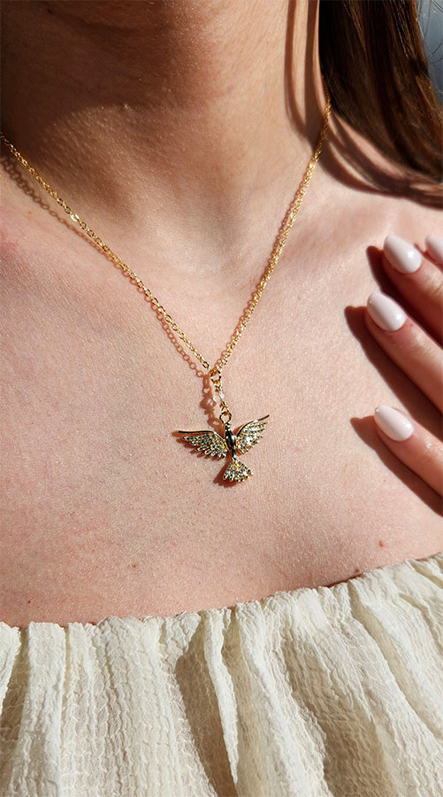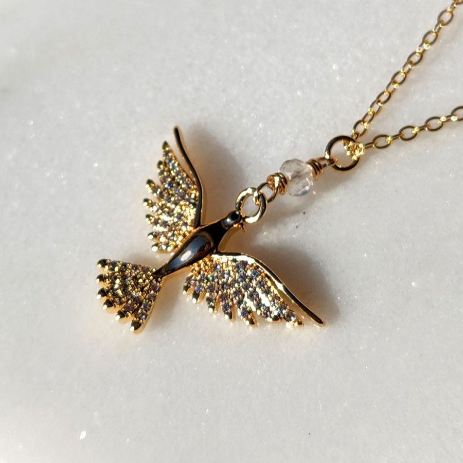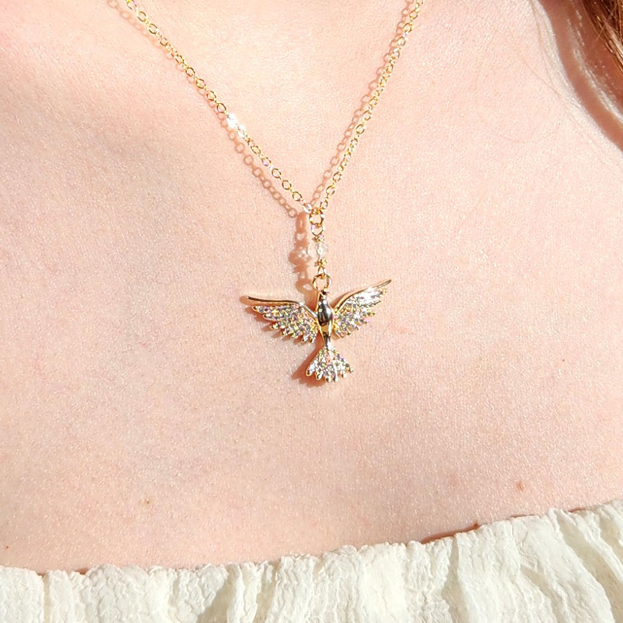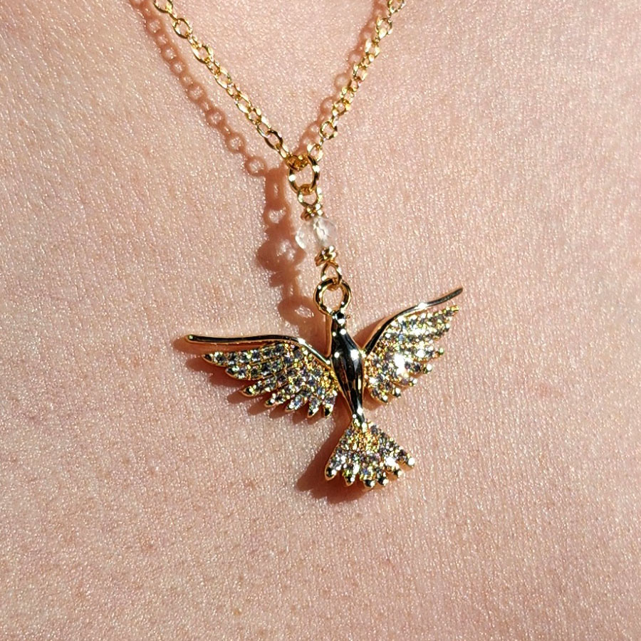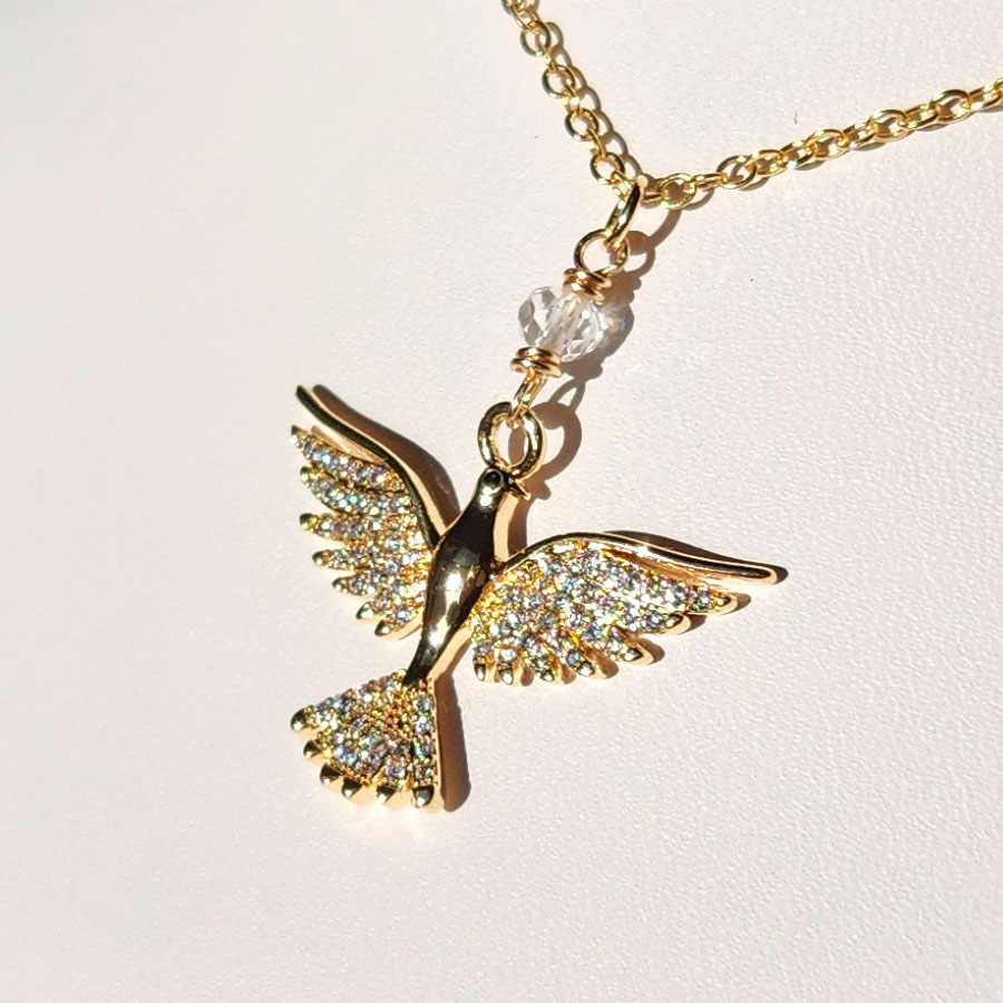 Medieval inspired gold plated open wing dove necklace with CZ and clear quartz. Peace, protection, and divine guidance.