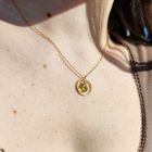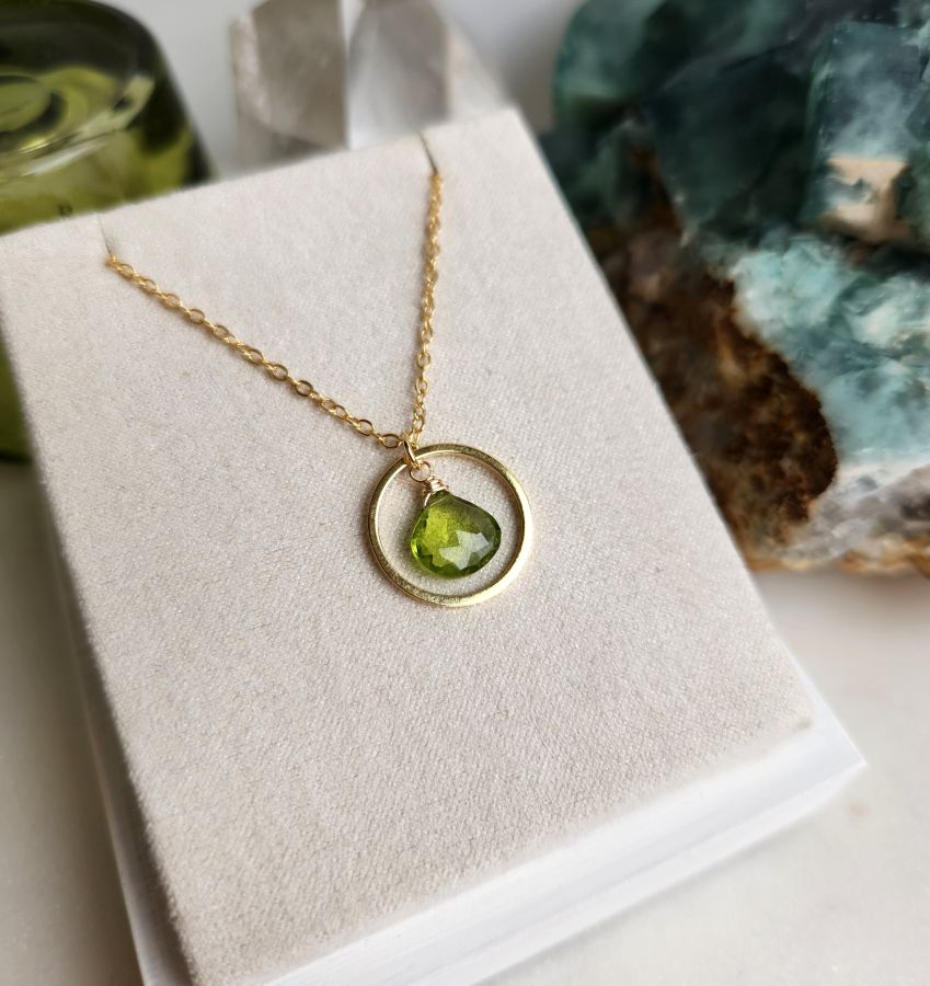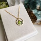 Peridot inside gold circle pendant necklace. Metals are 18kt gold plate over brass. All metals are nickel-free and lead-free.